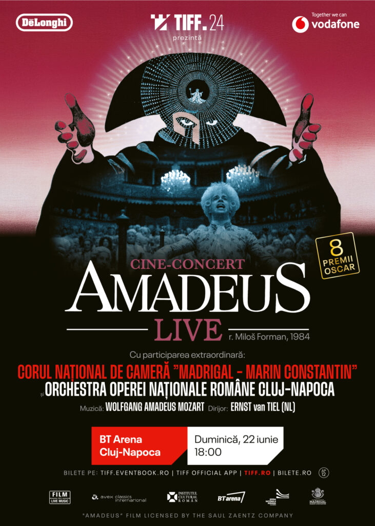 Cea de-a 24-a ediție a Festivalului Internațional de Film Transilvania (13 – 22 iunie 2025, Cluj-Napoca) va fi gazda unui eveniment care reunește filmul și muzica într-o experiență unică: Amadeus LIVE. După reprezentații la New York Philharmonic și la Royal Albert Hall Londra, filmul Amadeus (r. Miloš Forman, 1984) despre viața și opera lui Wolfgang Amadeus Mozart va fi proiectat la TIFF, iar coloana sonoră va fi asigurată de Orchestra Operei Naționale Cluj-Napoca sub conducerea dirijorului olandez Ernst van Tiel cu participarea extraordinară a Corului Național de Cameră „Madrigal – Marin Constantin”, dirijor Anna Ungureanu. Evenimentul, care marchează și 40 de ani de la lansarea filmului, va avea loc duminică, 22 iunie, începând cu ora 18:00, la BT Arena.